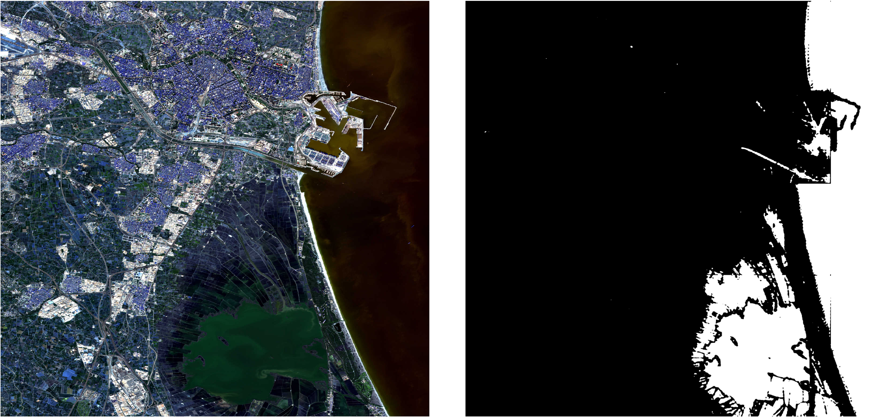 Below is an example of the input and the expected output. The input image (left) is a satellite picture of Valencia, Spain during the 2024 flood. The output image (right) shows the areas predicted as flooded (in white) by the Prithvi model.